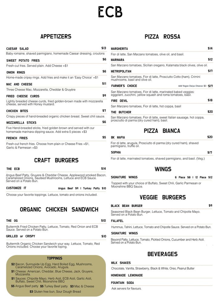 Welcome to ECB, a vibrant Italian gem nestled in Ridgewood, NY, where gourmet pizza meets a casual and inviting atmosphere. Our menu is a delightful fusion of traditional Italian flavors and modern culinary twists, designed to cater to all appetites. From our signature Margarita Pizza to delectable pasta dishes like BLT Benedict and Baked Clams, every bite promises to transport you to Italy.